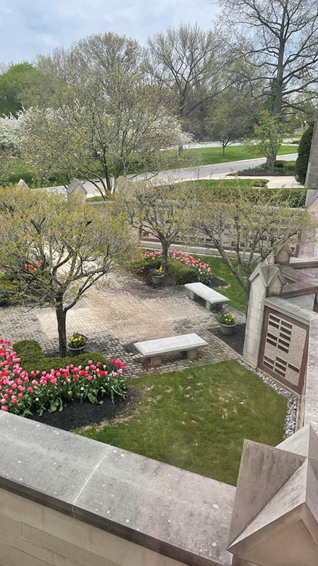 Nestled in the shadow of the spire, outside the east wall of the sanctuary, this beautiful and consecrated place incorporates Indiana limestone and Italian granite with tasteful landscaping, walks, and benches to create a lovely retreat for generations to come. The Celtic cross (just outside the Garden) is from the Vermont Street church, where it was at the peak of the gable over the Ascension Window. Perpetual maintenance is assured through the Session of Second Presbyterian Church.